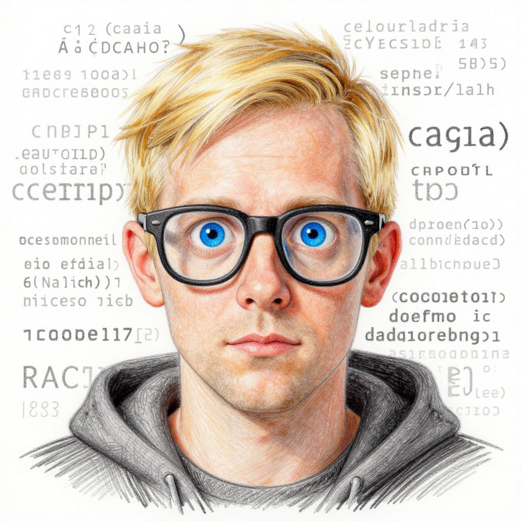 Photorealistic digital portrait of a young white man with short, blonde hair and blue eyes. He wears large, black, rectangular glasses and a gray hooded sweatshirt. His expression is neutral. The background is white with random, black, computer-generated text in various fonts and sizes, including "cata" and "RAC." The text is semi-transparent, creating a layered effect. The image uses sharp, detailed textures and vibrant colors, particularly highlighting the subject's eyes and glasses. The style combines realism with a slightly surreal, tech-themed aesthetic.