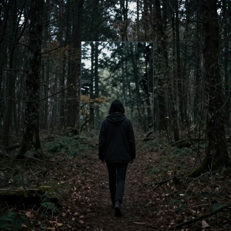 Amidst the somber embrace of an endless forest, a solitary figure walks toward a mirror that distorts not reflection, but the boundaries of self, evoking a haunting blend of introspection and dread.