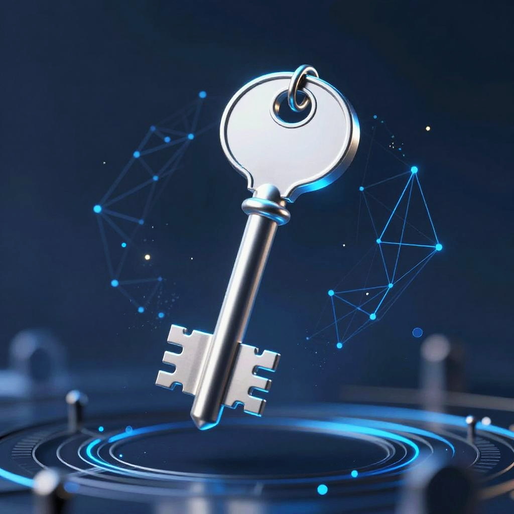 19368514, a mysterious encrypted key floating in mid-air, illuminated by soft blue light, surrounded by complex geometric patterns and floating particles, evoking themes of digital security and futuristic technology.
