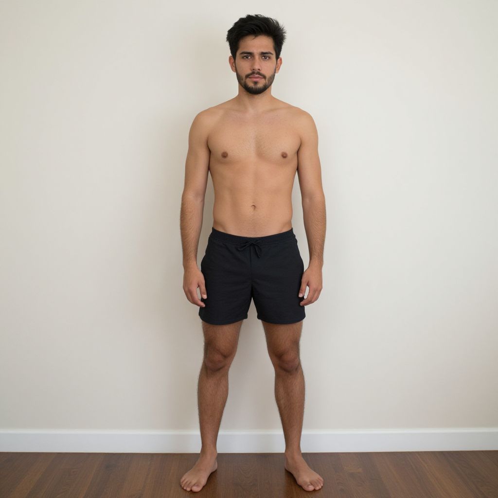 Photograph of a shirtless, bearded man with medium brown skin, short black hair, wearing black shorts, standing against a white wall on wooden