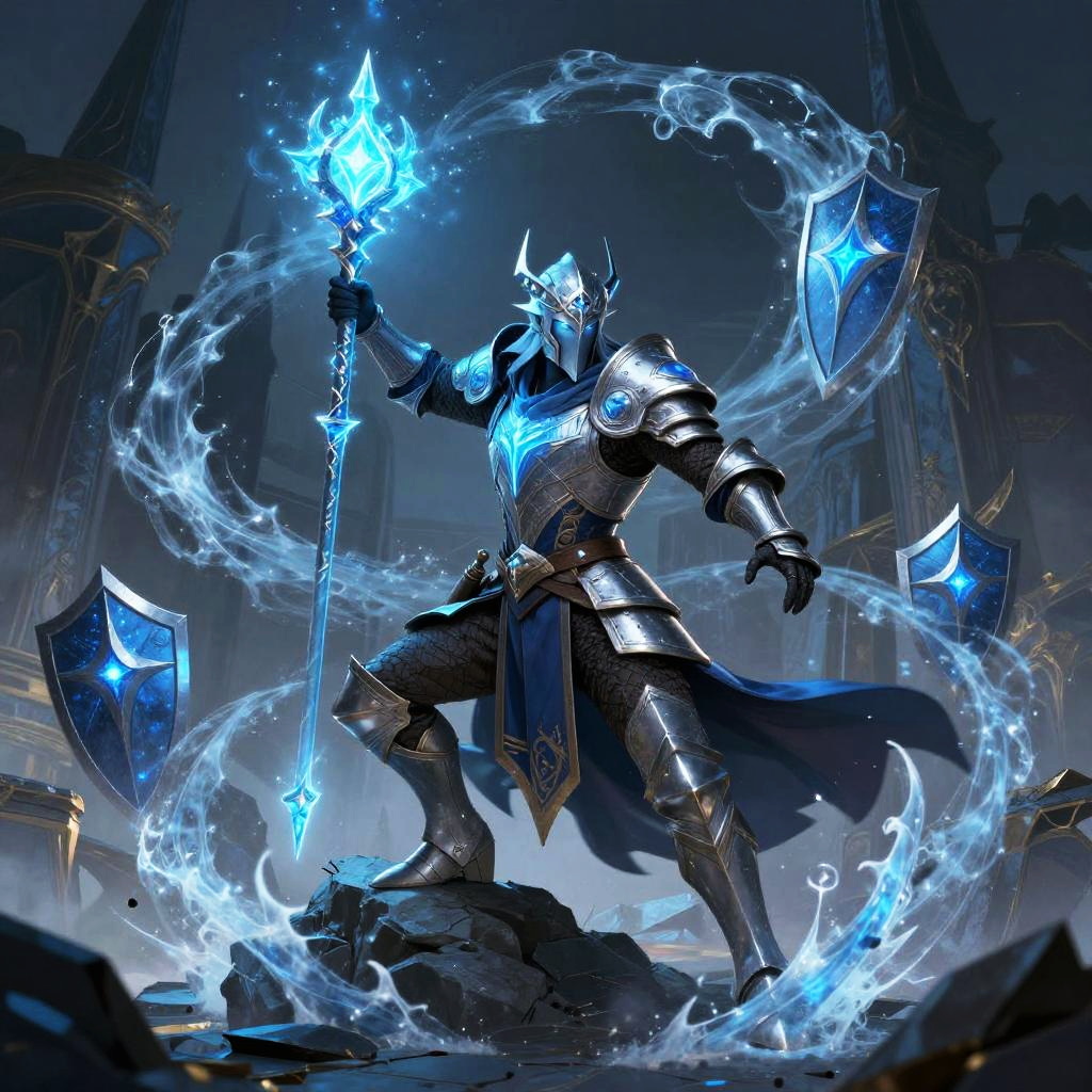 DND wizard art featuring a battle-ready spellcaster in enchanted armor, wielding a staff emitting icy blue magic, surrounded by swirling frost and magical shields, dynamic pose, highly detailed fantasy environment with crumbling ruins