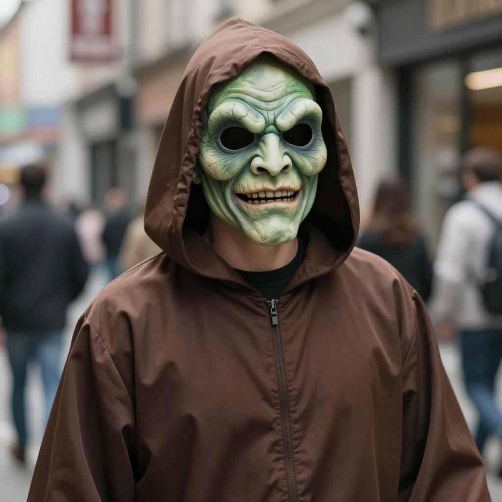 Blankman costume, photograph of a person wearing a green mask with exaggerated, creepy facial features, hooded brown robe, realistic ure, street background with blurred people and storefronts, urban setting, daytime, realistic style, detailed, masked figure centered in the frame, casual clothing in background, slight bokeh effect, natural lighting, slightly unsettling mood, subtle shadows on mask and robe, soft focus on background