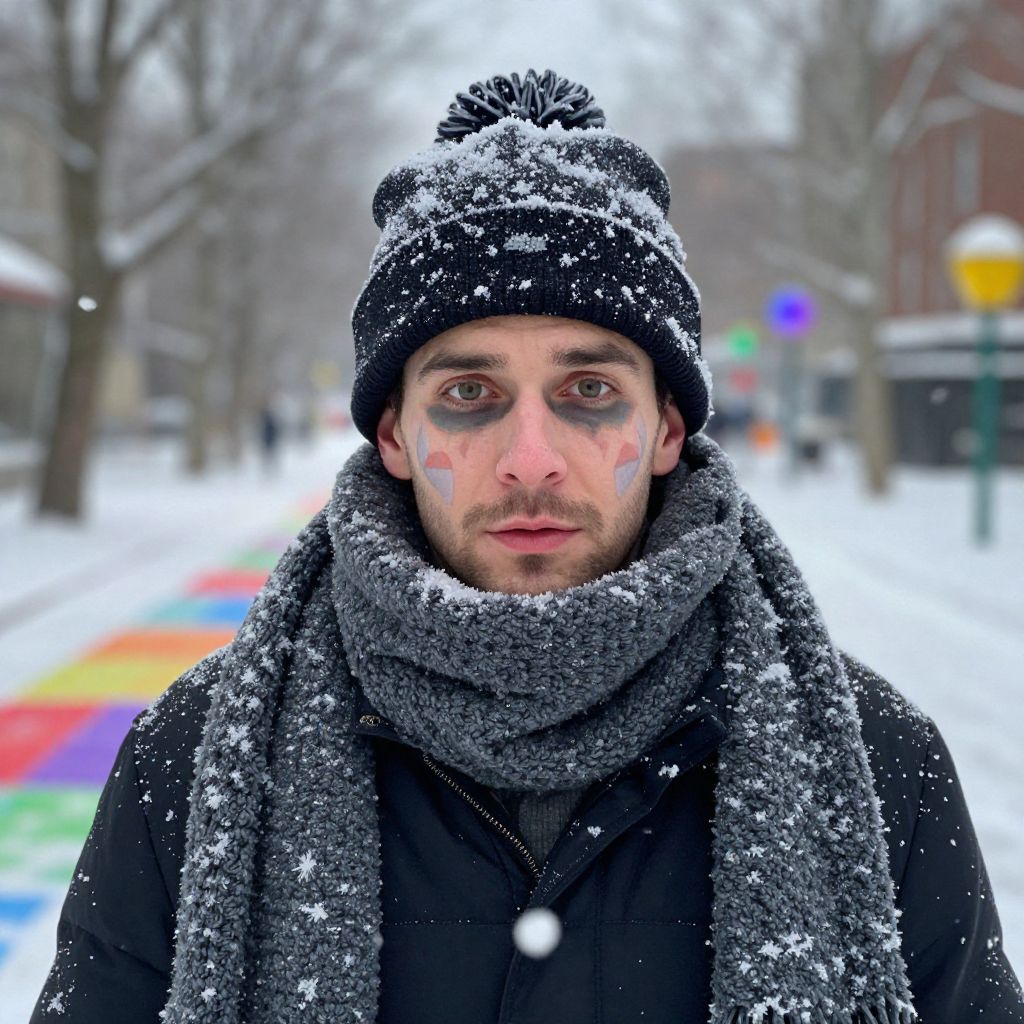 Winter wonderland setting: A man bundled up warmly, sporting an oversized scarf and hat, his face painted with exaggerated features, as if drawn from a 3M film. Snowflakes dance around him, casting colorful patterns on the ground. Whimsical, cartoonish elements add to the playful atmosphere, capturing the magic of winter's chill. Man has masculine face and piercing eyes