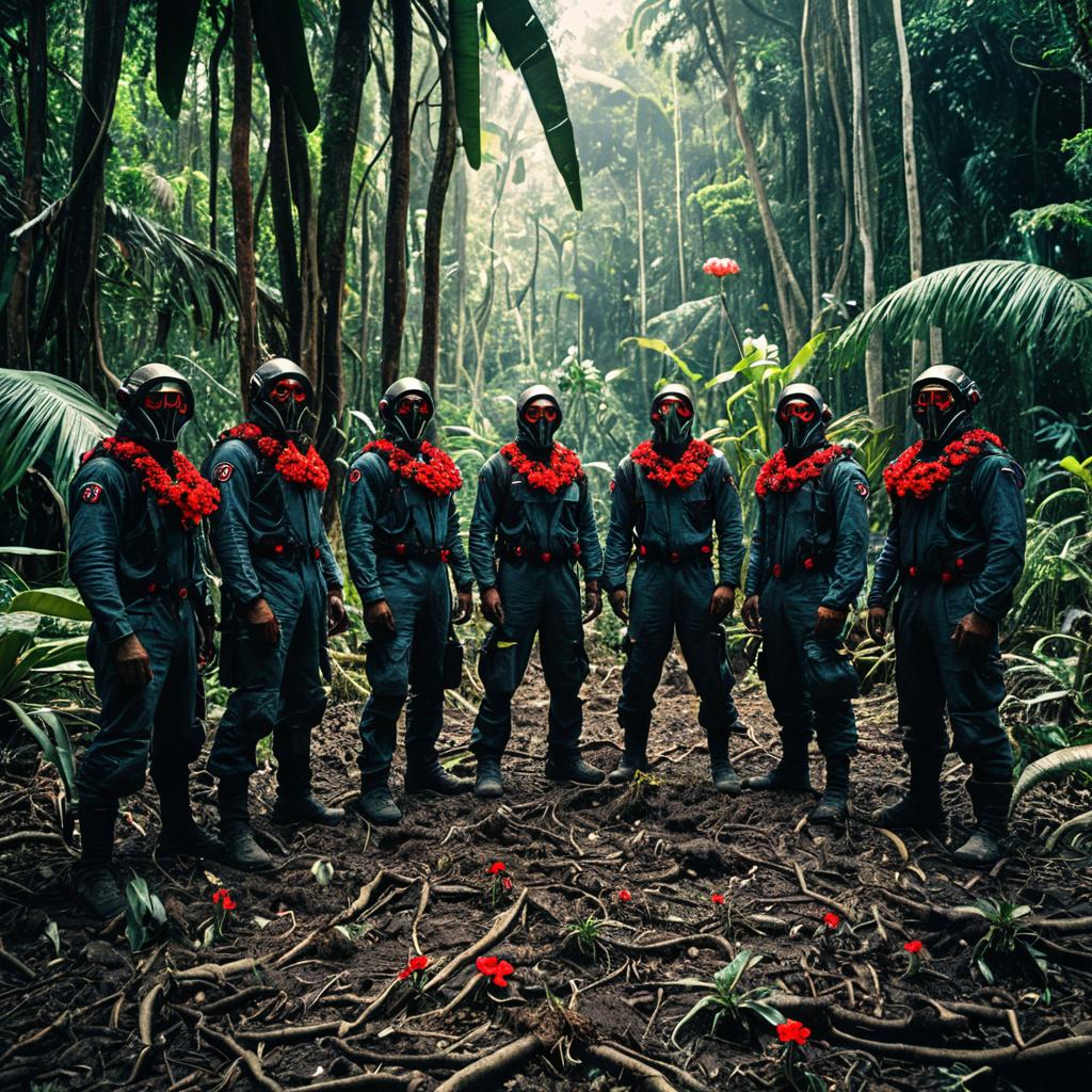 Group of seven futuristic soil scientists dressed in transhumanistic dark suits with red floral garlands around their necks standing in a dense Caribbean jungle. The environment features genetically modified trees, visible roots, and scattered red flowers, illuminated by dramatic epic lighting. The scientists wear helmets and full-body protective suits, emphasizing a distant future survival scenario.