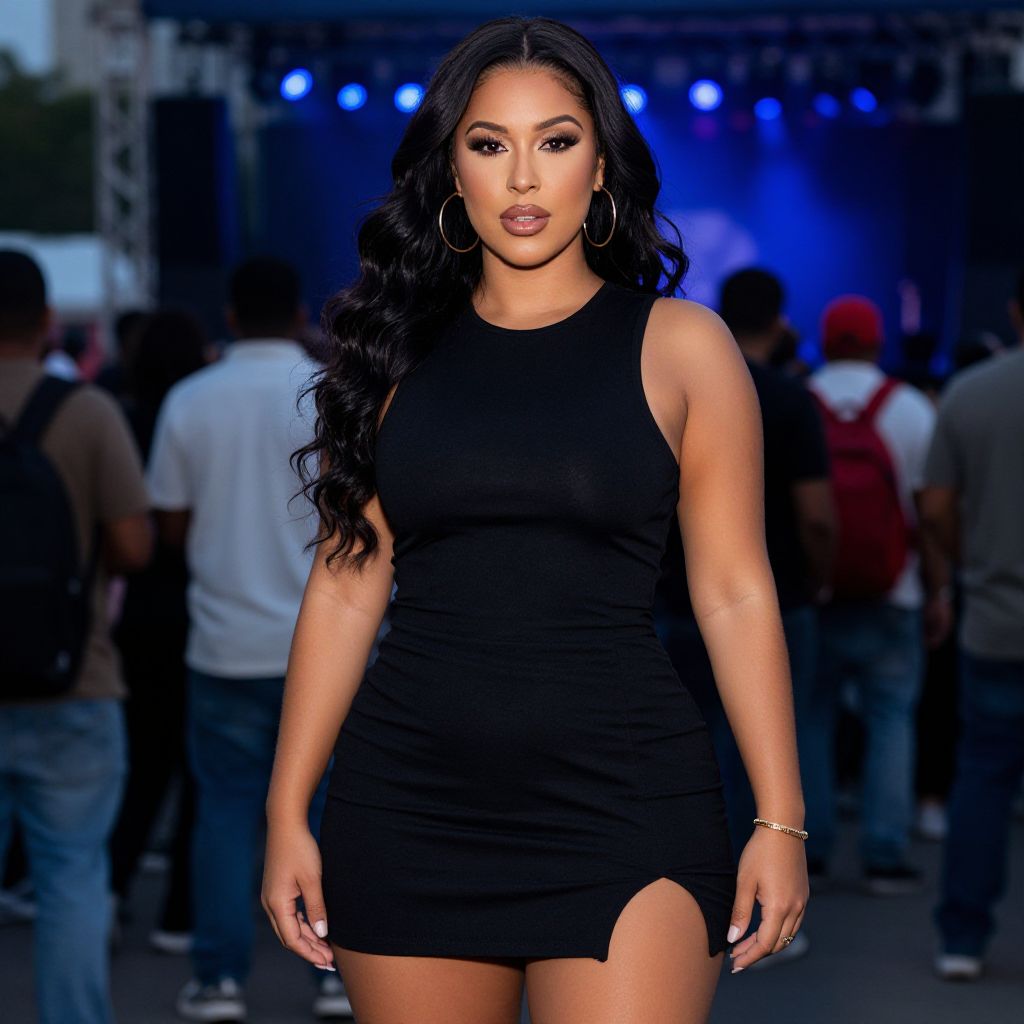 Photograph of a confident, dark-haired woman with tanned skin, wearing a black tank top, gold jewelry, and a white "New Era"