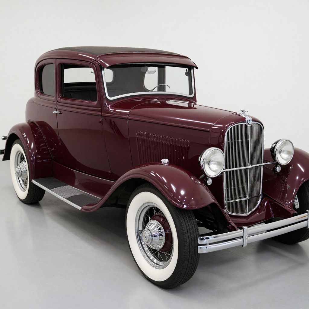Photograph of a classic maroon 1930s vintage car, showcasing a sleek, polished exterior with a glossy finish. The car features a prominent chrome grille, round headlights, and white-walled tires with chrome hubcaps. The body has a smooth, curved design with fender details and a running board. The windows are rectangular with black frames. The car is positioned at a slight angle, facing slightly to the right, against a clean, white background, emphasizing its elegant and timeless design. The overall style is reminiscent of early 20th-century automotive craftsmanship.