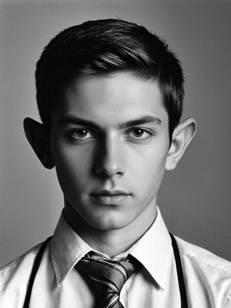 Monochrome, realistic portrait of a young man with pointy ears, looking directly at the camera. The subject has dark hair and is wearing a collared shirt with a patterned necktie. The image focuses on the upper body and captures a serious expression with closed mouth in a greyscale tone.