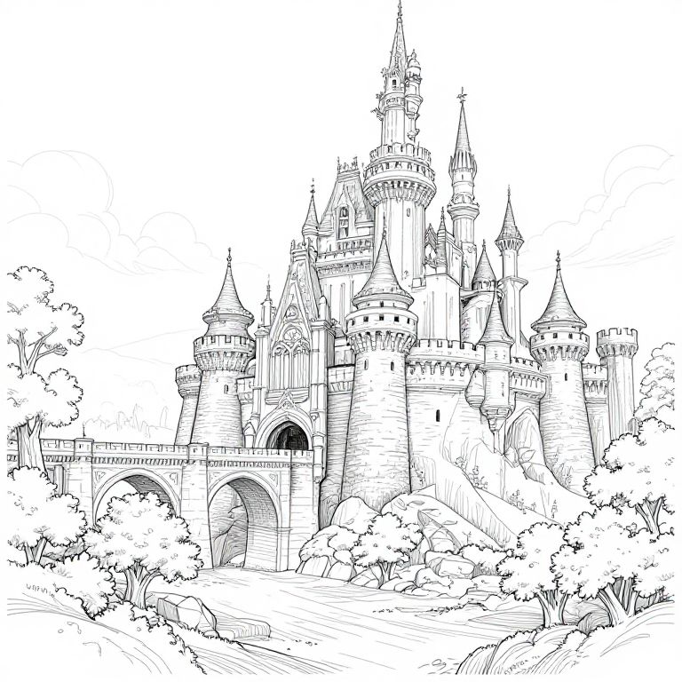 Detailed black-and-white line drawing of a grand, fairy-tale castle with multiple towers, arched entrances, and intricate stone patterns, surrounded by lush