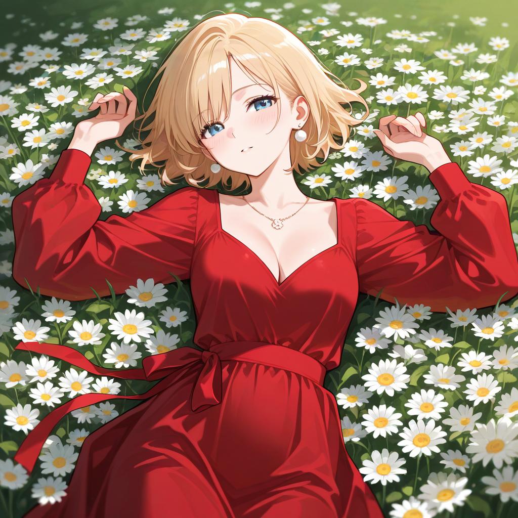 Digital illustration of a blonde woman with short hair lying in a field of white daisy flowers. She is wearing a vibrant red dress with long sleeves and a ribbon tied around the waist. The woman has blue eyes, pearl earrings, and a delicate necklace while looking directly at the viewer.