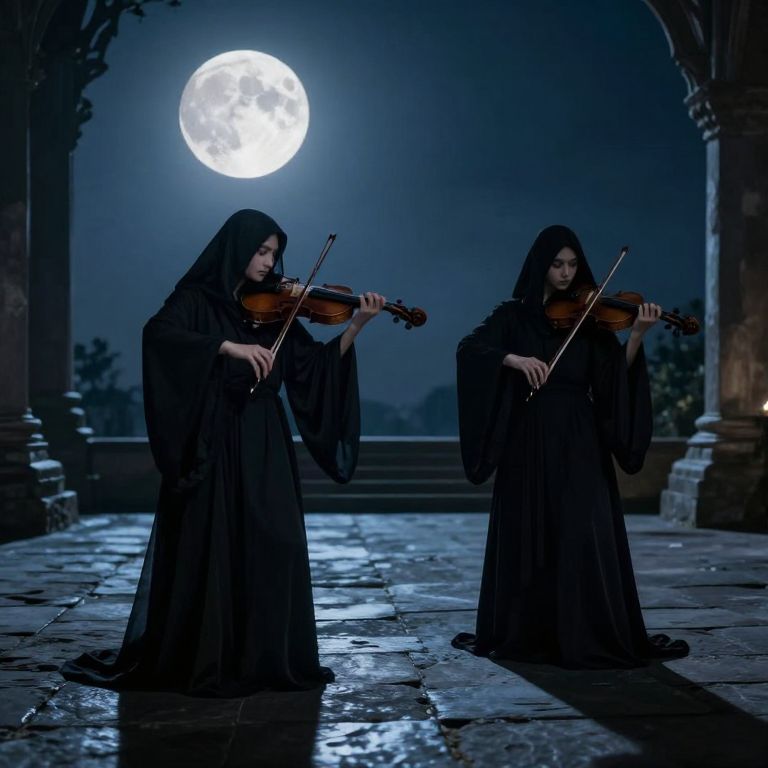 In the hushed embrace of moonlit stone, two cloaked figures weave a silent symphony, their violins echoing whispers of solitude and transcendence, as the ethereal glow of the full moon casts a hauntingly serene melody upon the ancient floor.