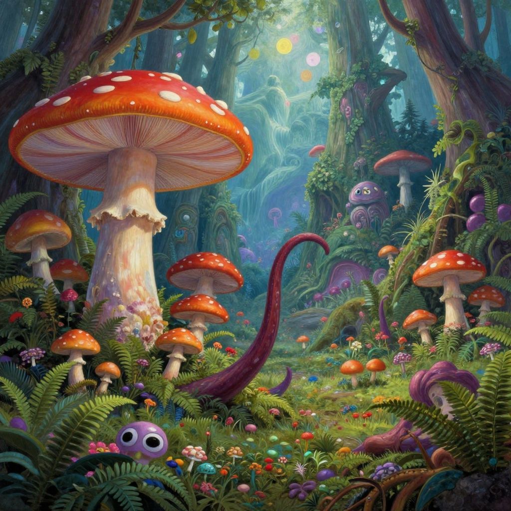 This is a vibrant, digital fantasy artwork depicting a whimsical forest scene. Large, red-capped mushrooms with white spots dominate the foreground, surrounded by lush green ferns and colorful flowers. Purple, tentacled creatures and a small, purple-eyed mushroom with googly eyes peek out from the foliage. The background features towering, moss-covered trees and a glowing, blue-green sky with a bright yellow sun. The light filters through the trees, creating a magical, ethereal atmosphere. The overall style is highly detailed and colorful, with a playful and enchanting mood.