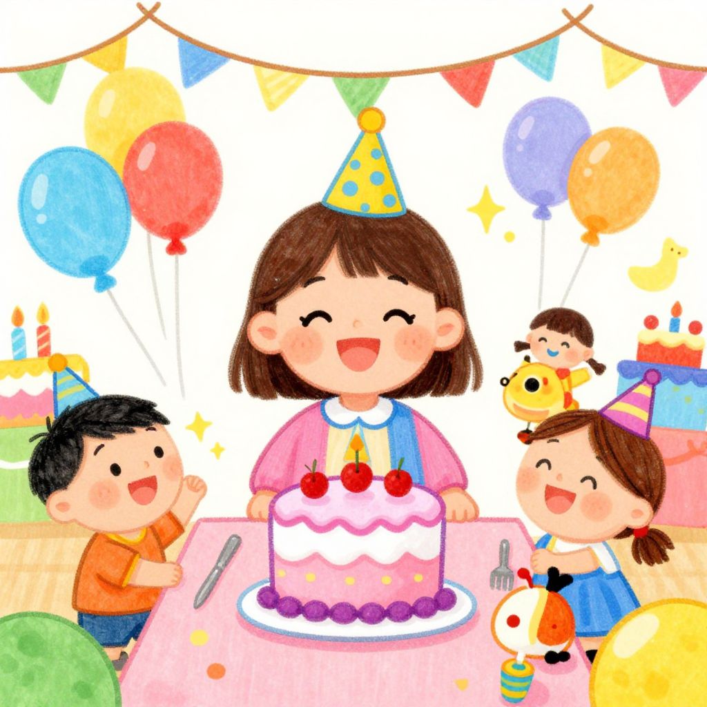 Digital illustration of four children celebrating a birthday outdoors. Bright balloons, colorful "Happy Birthday" banner, cake with strawberries, and flowers. Sunny, green