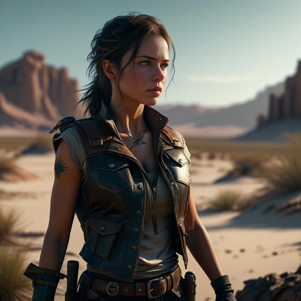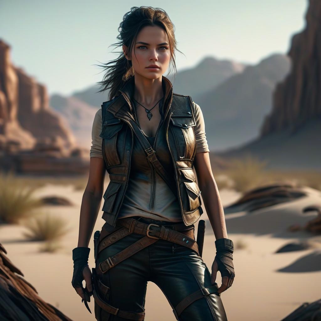 A mysterious huntress, standing on a desert island in a fitted leather vest and cargo pants. Stern expression, gritted teeth, cinematic lighting, ultra-detailed, 4K resolution