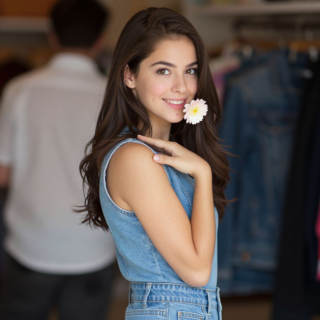 Billie jean fashion, 1girl, solo, brown hair, denim, long hair, pants, smile, mole, brown eyes, mole under mouth, flower, looking at viewer, jeans, sleeveless, lips, hand on own shoulder, blurry background, shirt, blurry