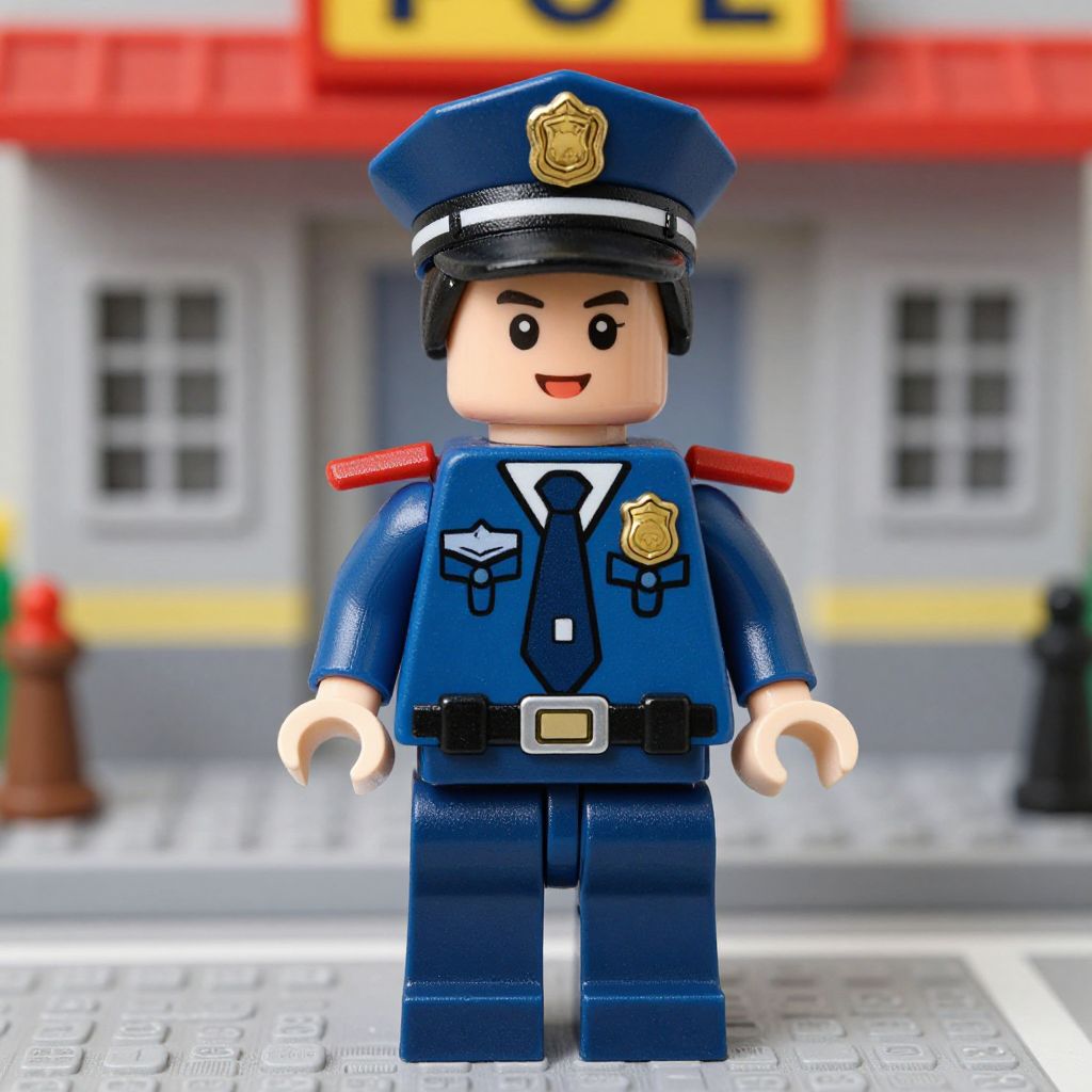 Photograph of blue LEGO police minifigure with black hair, badge, and red shoulder epaulettes, standing in front of a blurred LEGO