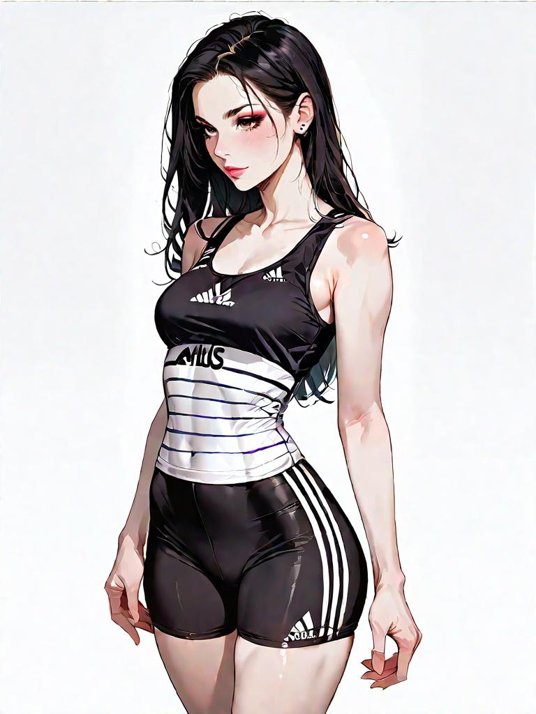 1girl, source_comics, realistic face, full body shot, Woman, athletic wear, black sleeveless tank top with white Adidas logo, scoop neck, racerback design, fitted purple bike shorts with white Adidas stripes and logo text along the side, mid-thigh length, indoor plain white background.