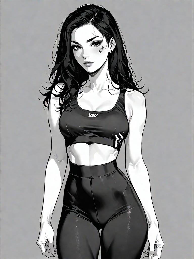 Digital illustration of a woman with an athletic build wearing black sleeveless Adidas tank top with a white logo, paired with fitted black mid-thigh bike shorts featuring white Adidas stripes and logo. The character has long dark hair and a realistic facial style, posed against a plain white indoor background.
