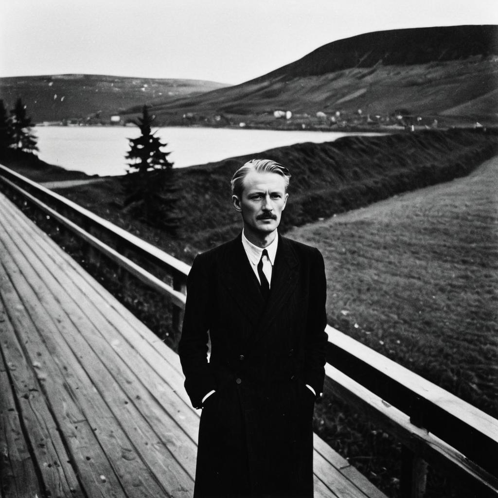 Black and white photograph of a light-skinned man with blonde hair and a mustache standing on a wooden bridge. He is wearing a dark double-breasted overcoat, white shirt, and dark tie. The background features a rural landscape with fields, hills, and a church spire visible in the distance under an overcast sky.