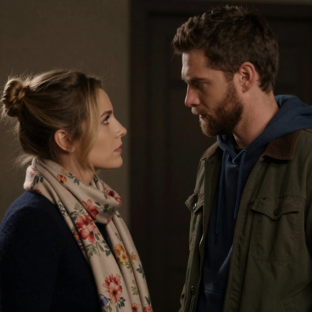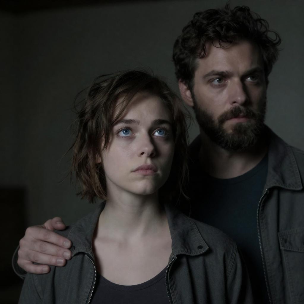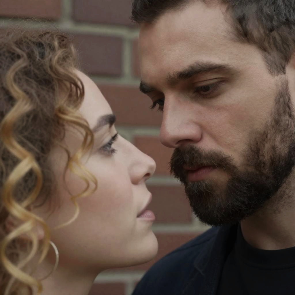 Photograph of a man and woman sitting closely together in dim light. Man with short dark hair, beard, wearing gray blazer, playing acoustic guitar. Woman with long dark hair, wearing dark top, leaning her head on his shoulder. Dark, patterned tapestry background. Intense, focused expressions. Warm, yellow light on left.