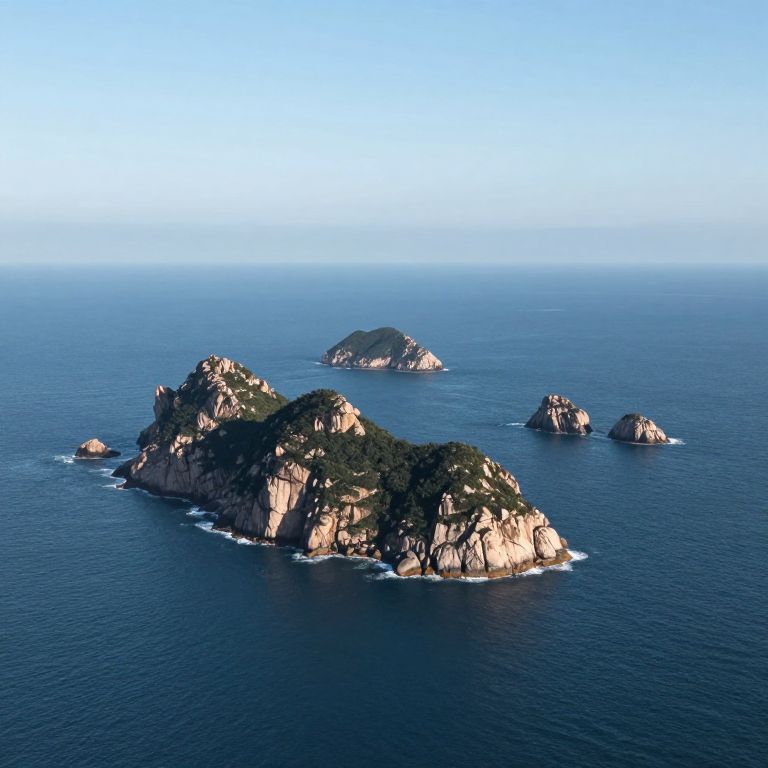 Aerial photograph of a serene coastal landscape featuring several small, rocky islands with lush green vegetation dotting a calm, deep blue ocean. The foreground island has steep, rugged cliffs, while the background island is smaller and more rounded. The horizon is clear with a bright, cloudless blue sky meeting the ocean. The islands are scattered, each surrounded by gentle waves. The image captures the natural beauty and tranquility of the scene.