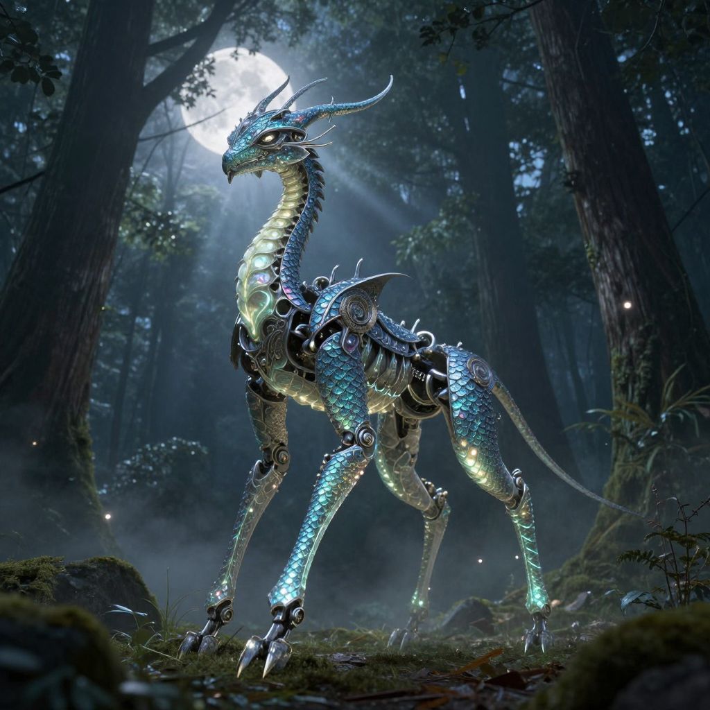 Jointed fantasy creature, elegant articulated limbs covered in iridescent scales, bioluminescent veins glowing softly under a moonlit forest canopy, intricate armor pieces attached at the joints, mystical atmosphere with mist and soft light beams filtering through trees.