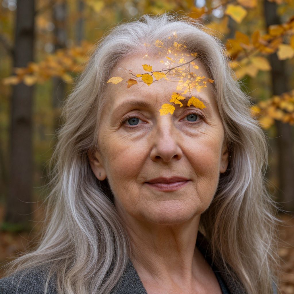 A photograph of an elderly woman with long, wavy, silver-gray hair, standing in a forest during autumn. She has fair skin, blue eyes, and a gentle smile. A single branch with bright orange leaves rests on her forehead, casting a shadow on her face. She wears a dark, textured top. The background features blurred, tall trees with yellow and brown leaves. The image has a soft, natural light, emphasizing the woman's serene expression and the vibrant autumn colors. The photo has a slight, artistic blur effect, focusing on the woman's face and the leaves.