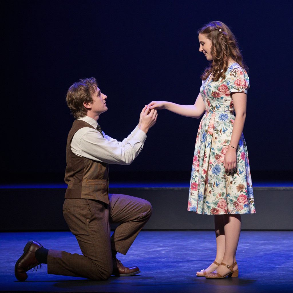 Kneeling gentleman extends his hand to a smiling woman in a floral dress during a theatrical performance at the Utah Shakespeare Festival.