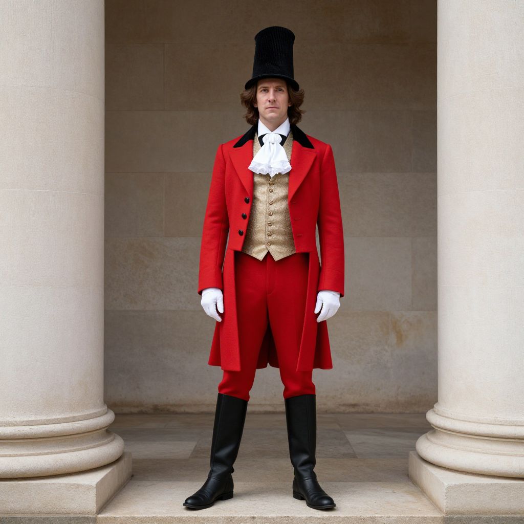 Photograph of a Caucasian man with wavy brown hair and a slender build standing between two large, white stone columns. He wears an 18th-century-style outfit: a vibrant red coat with black lapels, white shirt with a high collar, gold waistcoat, and red breeches. He also sports a tall black top hat, white gloves, and black knee-high boots. The background is a simple, beige stone wall. The man's expression is neutral, and he stands confidently with his arms at his sides. The image has a historical, formal aesthetic.