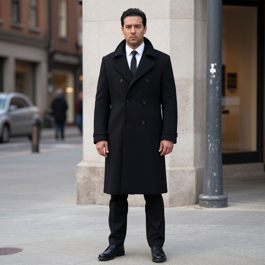 "Zavetti Canada Coat Costume, man in a coat standing on a street corner"