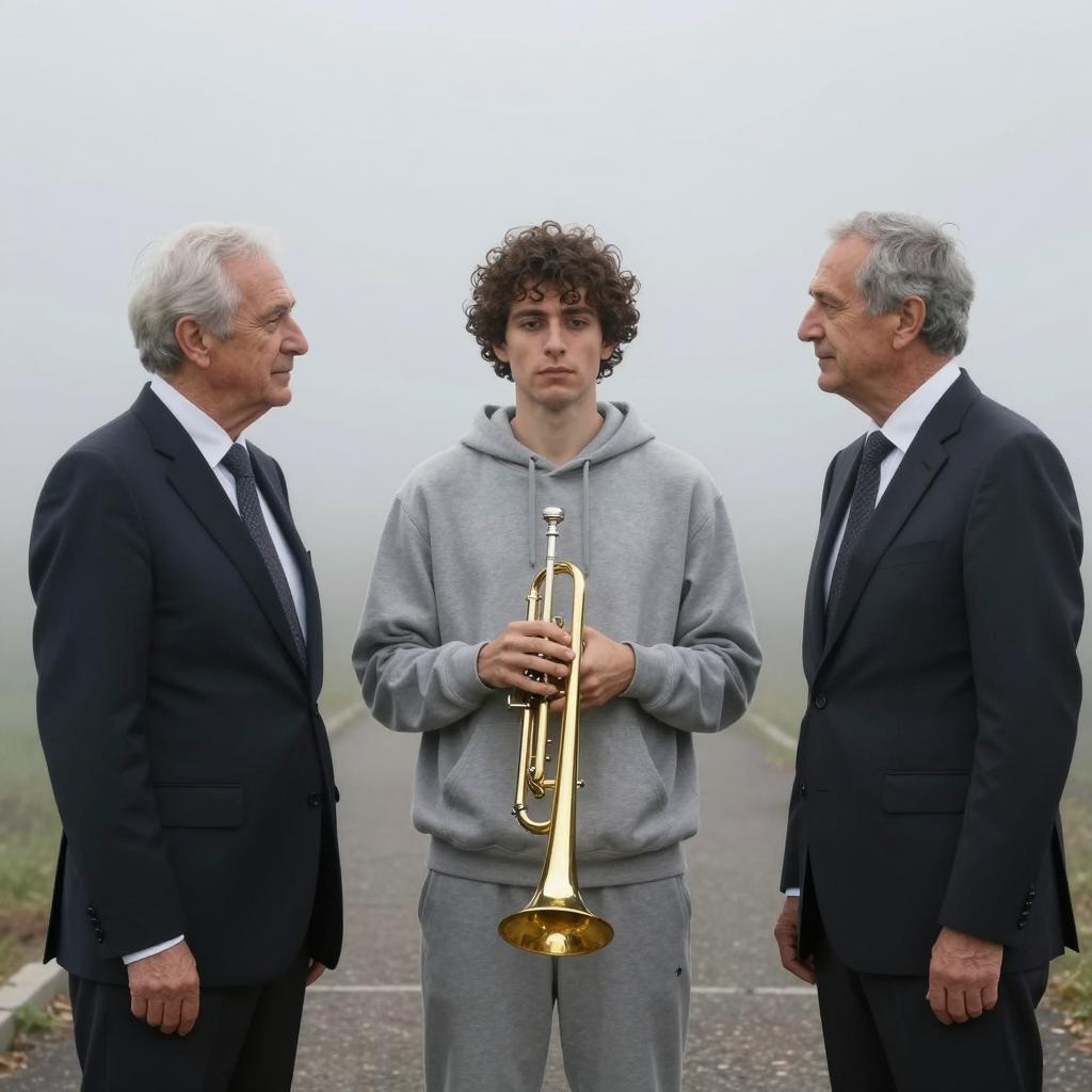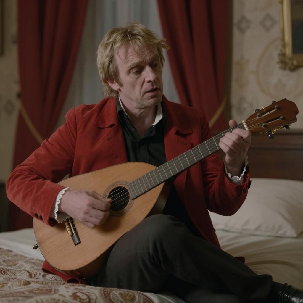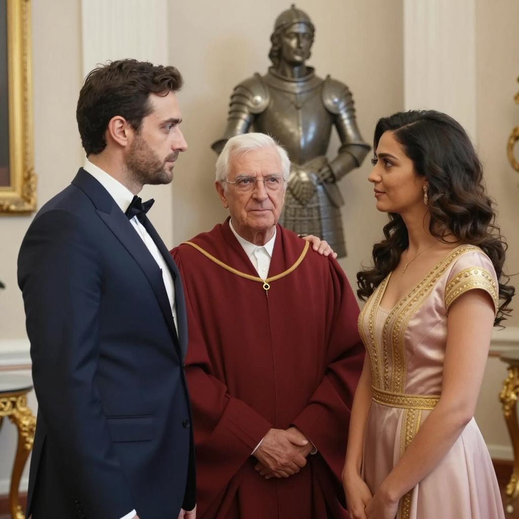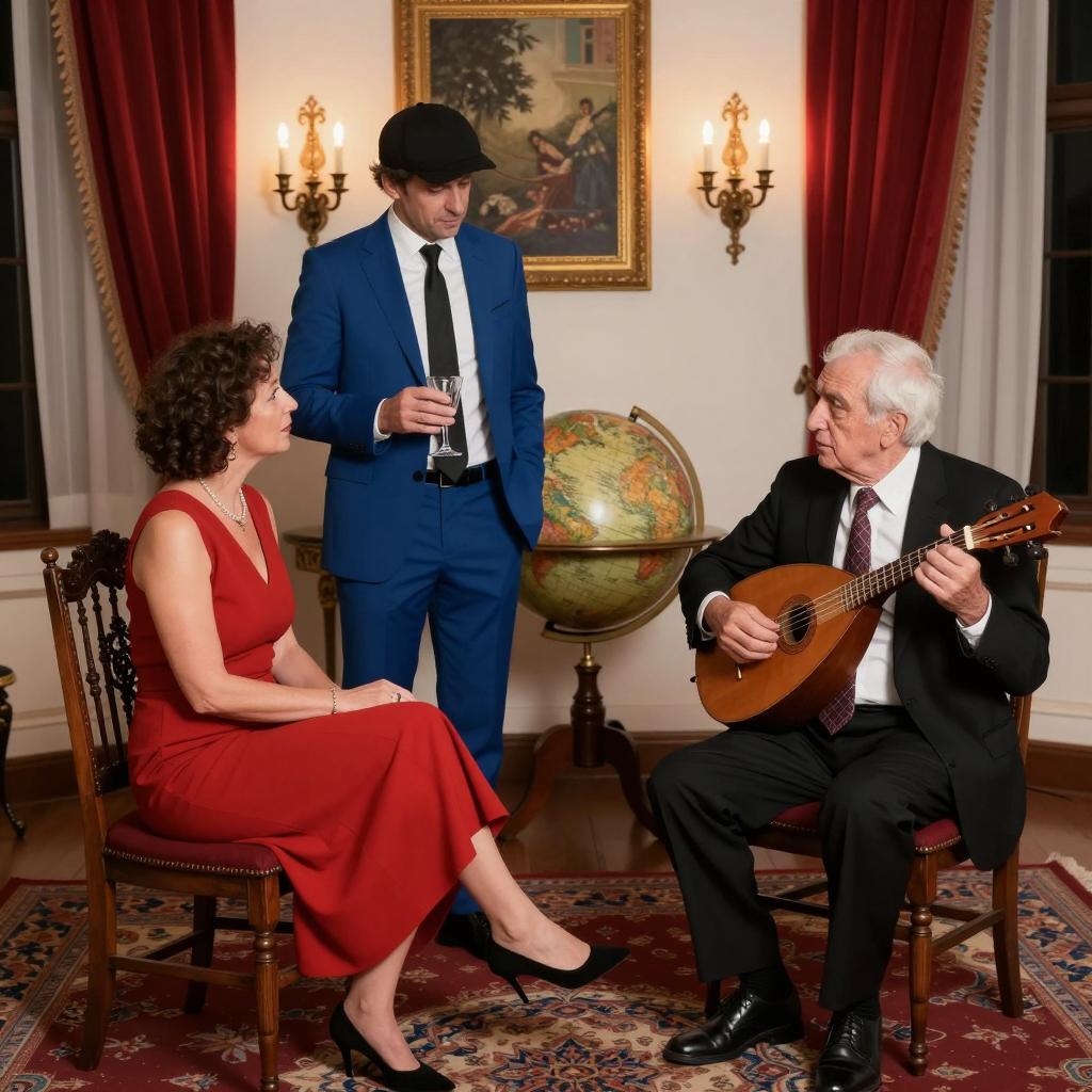 Three people in an ornate room. Man in blue suit, black cap, standing, holding a glass. Woman in red dress, seated, talking. Elderly man, black suit, playing lute, seated on right. Globe on wooden stand in background. Red curtains, wooden furniture, candle wall sconce. Woman has dark hair, man has white hair. Room has rich, patterned rug.