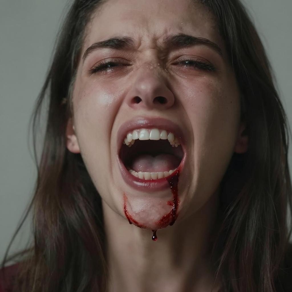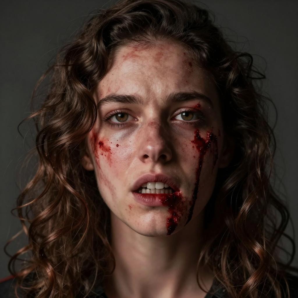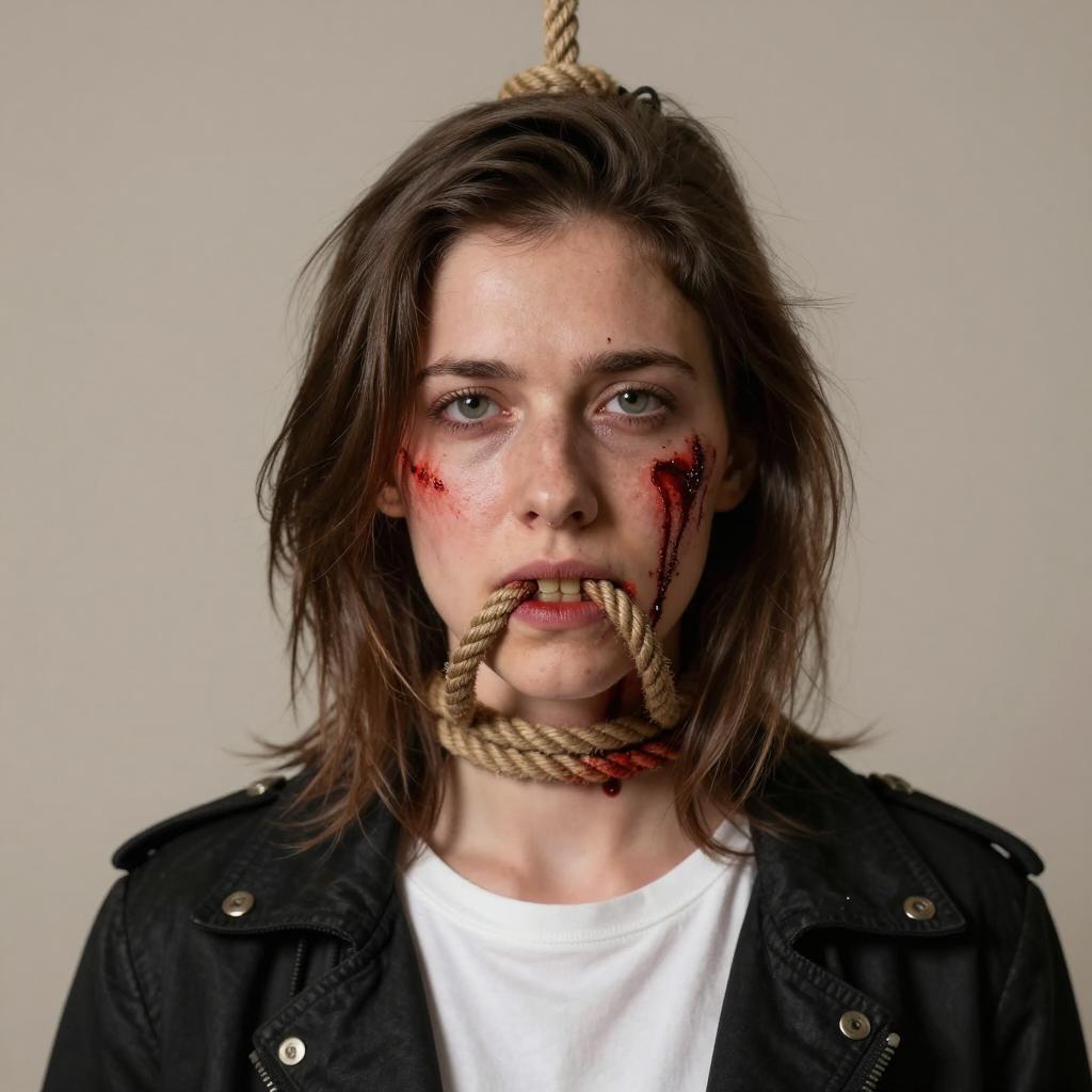 Photograph of a bound woman with shoulder-length brown hair, blood on her cheeks, and a gag over her mouth. She is tied with rope around her head and neck. She wears a black jacket over a white shirt. Background is a plain, beige wall.