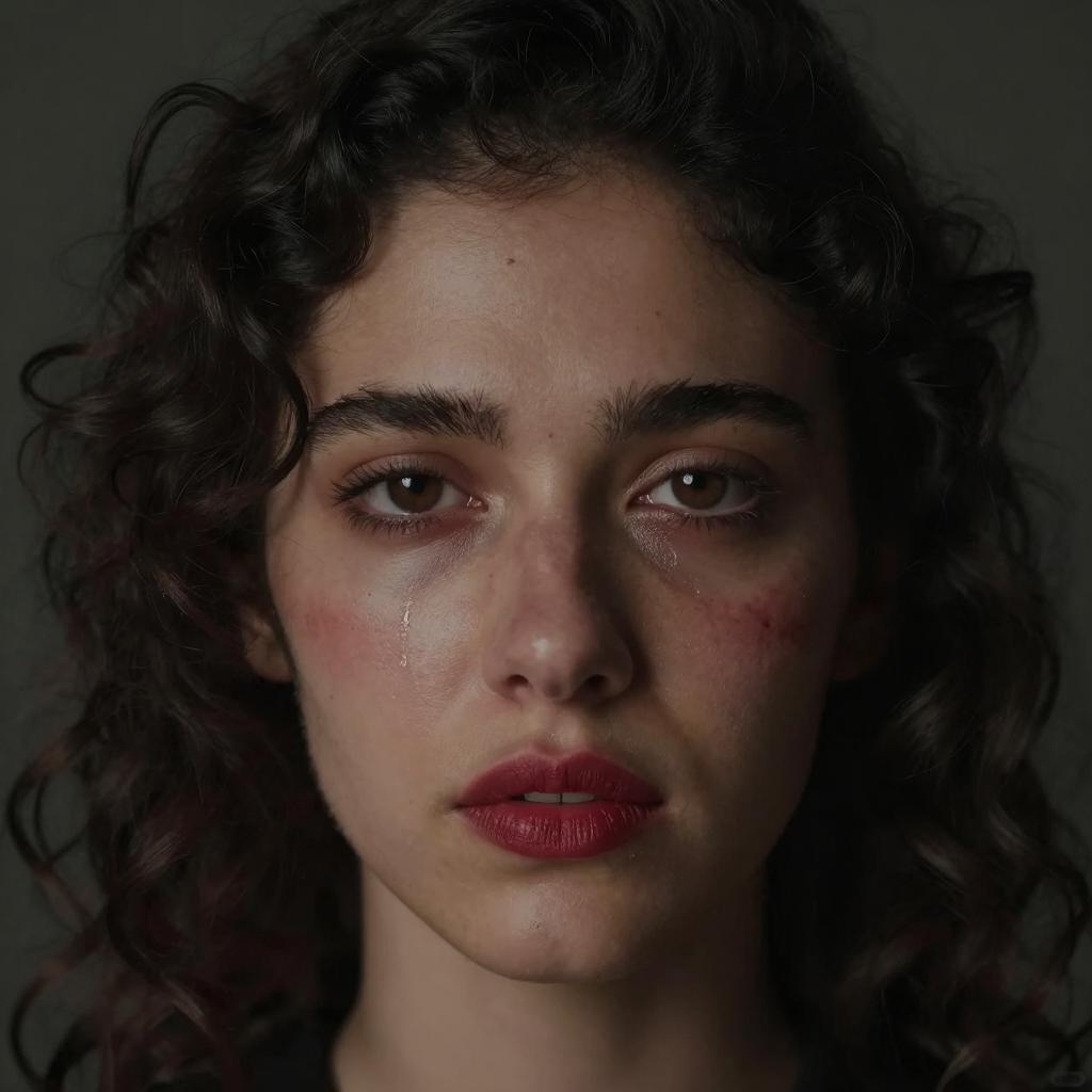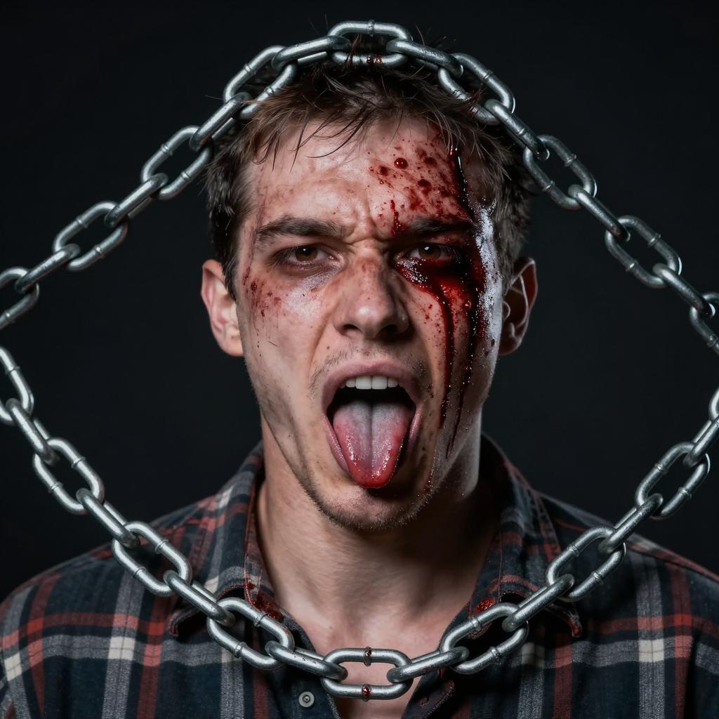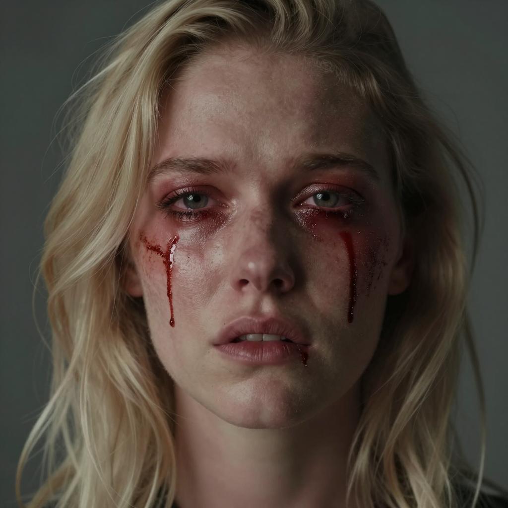 Photograph of a bound woman with shoulder-length brown hair, blood on her cheeks, and a gag over her mouth. She is tied with rope around her head and neck. She wears a black jacket over a white shirt. Background is a plain, beige wall.