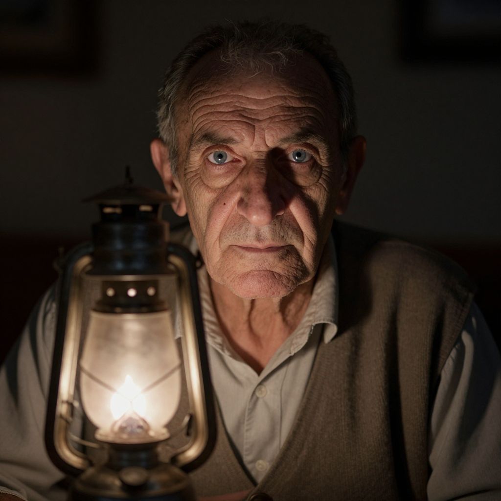 Photograph of an elderly white man with deeply wrinkled skin, short gray hair, and blue eyes, illuminated by a dimly lit, vintage oil lantern in the foreground. He wears a white, slightly worn button-up shirt with a brown vest. The background is dark and blurred, emphasizing the lantern's warm glow on his face, which casts dramatic shadows. His expression is intense and contemplative, with slightly furrowed brows and a solemn mouth. The overall mood is somber and nostalgic, highlighting the contrast between the bright lantern and the dark surroundings.