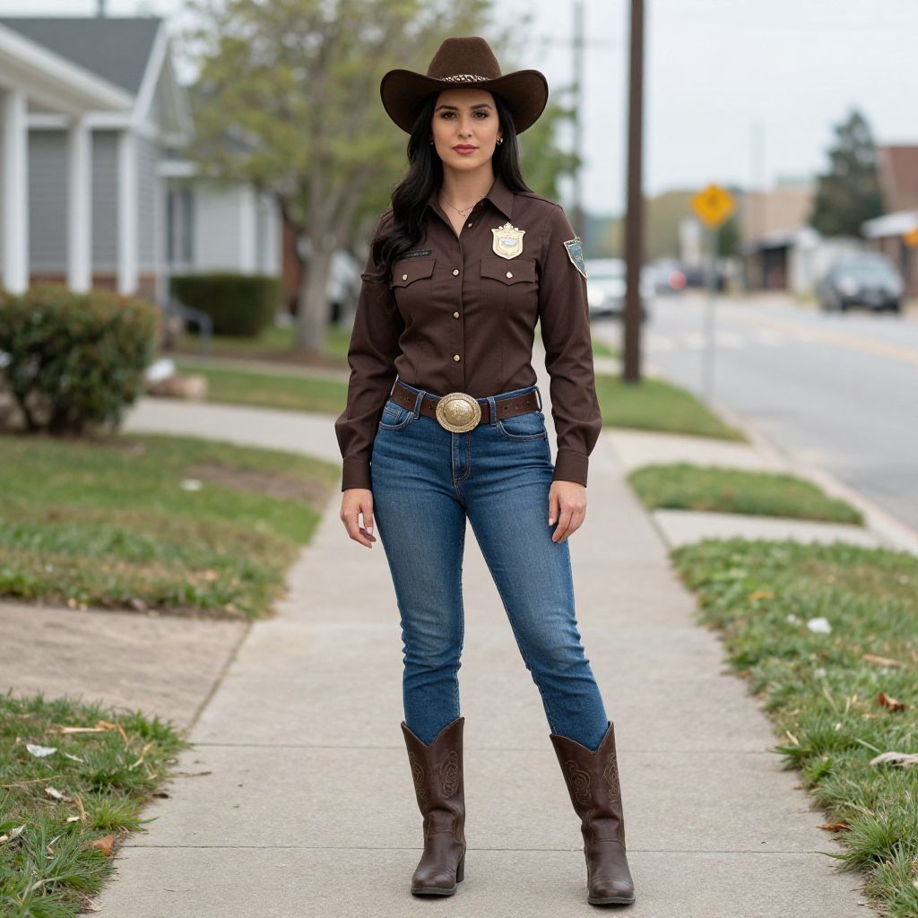 Photograph of a Latina woman standing on a suburban sidewalk. She has long black hair, fair skin, and is wearing a brown cowboy hat, dark brown button-up shirt with a sheriff's badge, blue jeans, and brown cowboy boots with intricate stitching. Her belt has a large, ornate gold buckle. She stands confidently with hands by her sides. The background shows a quiet residential area with green lawns, a sidewalk, a street, and blurred houses and trees. The sky is overcast, adding a soft light to the scene. The overall composition emphasizes her authoritative presence in a small-town setting.