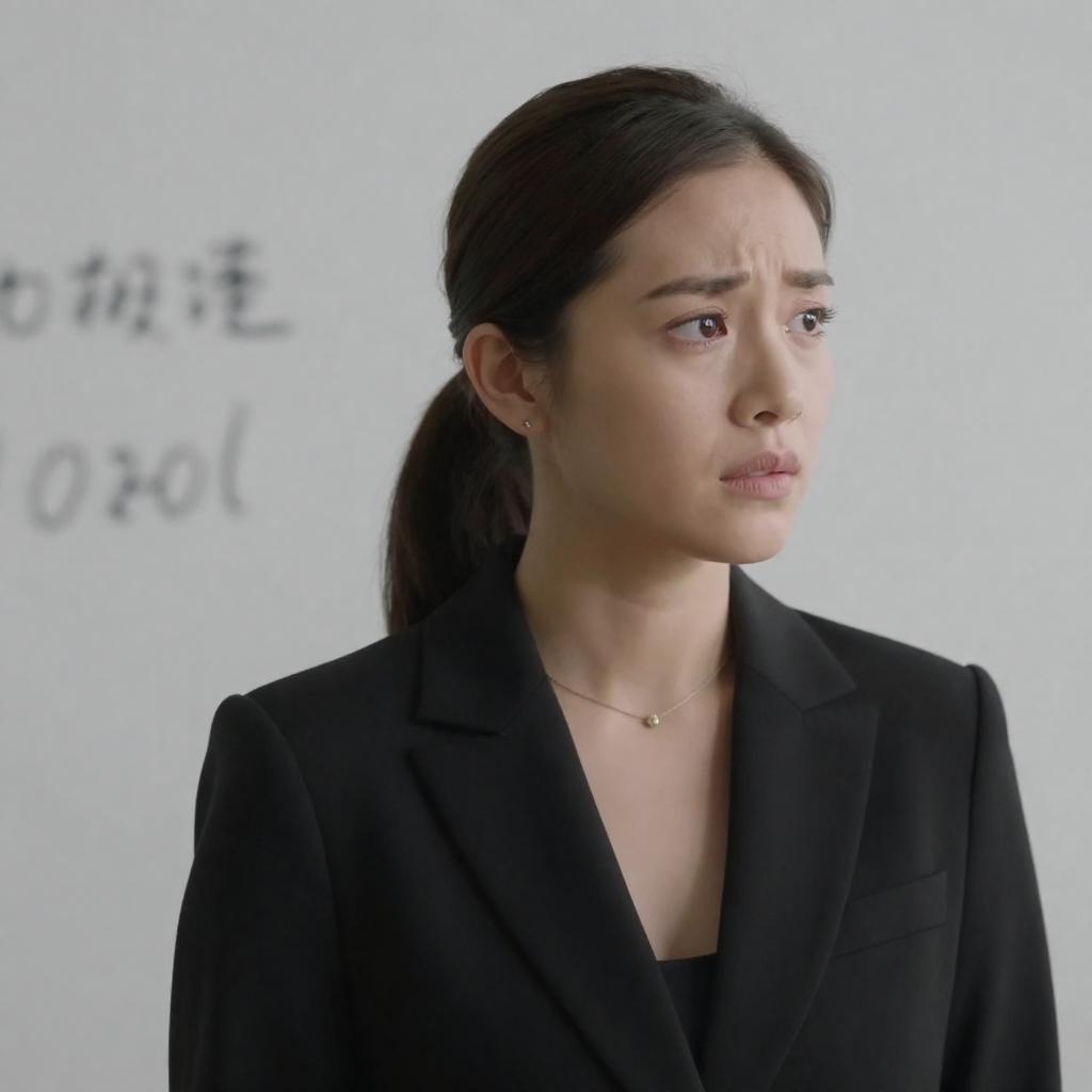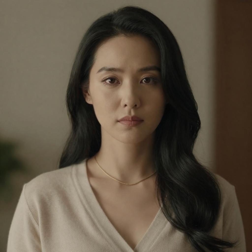 Photograph of a woman in profile with dark hair, fair skin, and a small mole on her right cheek. She wears a black top, looking to the right with an intense expression. Dark background. Bright light on her face. Movie still.