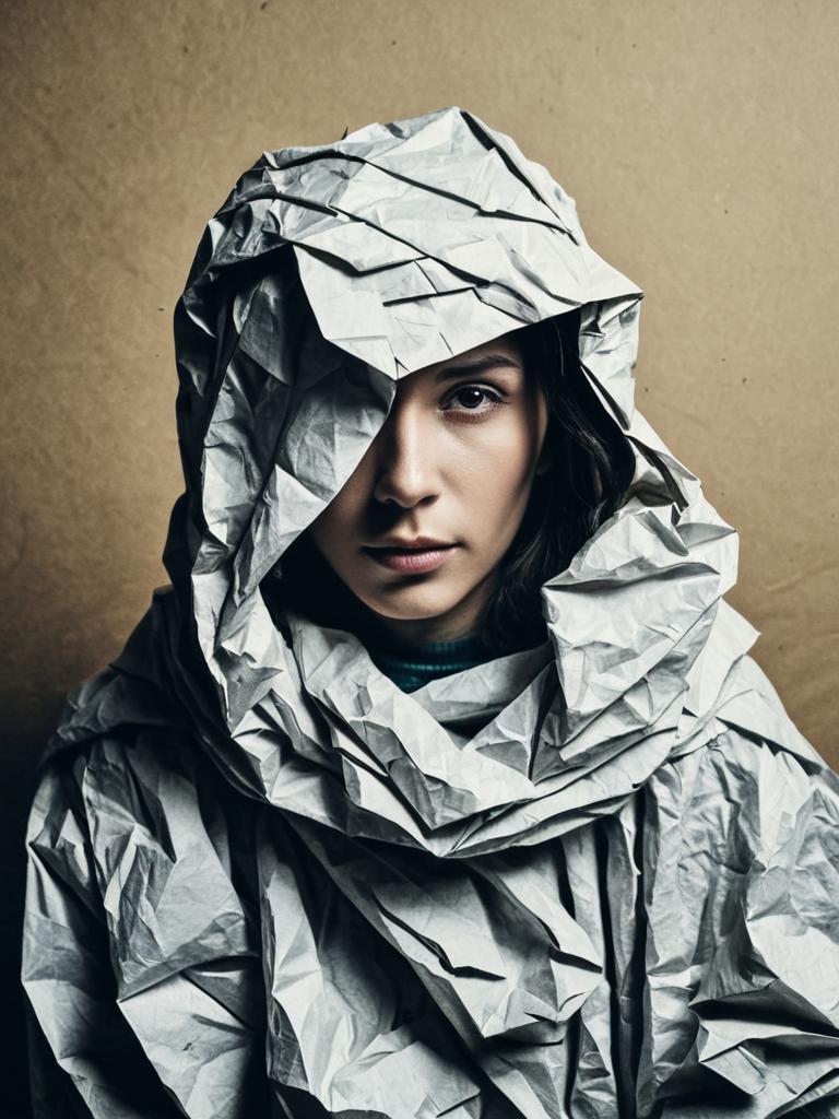 Person in Crumpled Paper Costume, artistic photorealistic portrait