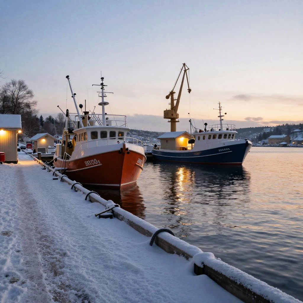 Strelka harbor in winter, snow-covered docks with fishing boats and cranes, warm lights glowing from small cabins, frost on the water surface, peaceful early morning scene, detailed texture focus, soft natural color palette