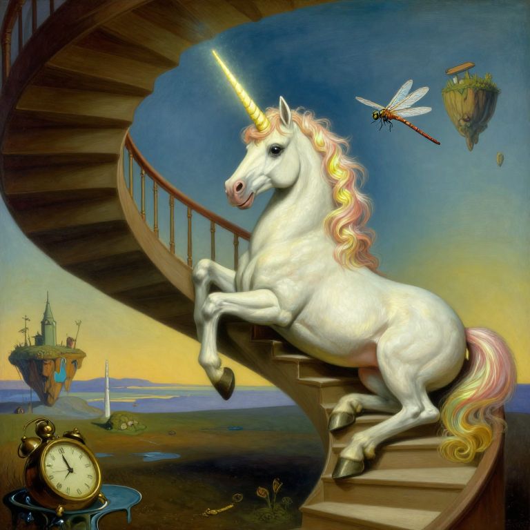 Craft an image embodying the surrealism of Dali's paintings, depicting a whimsical scene where a regal unicorn rests upon a grand helical staircase, its horn emanating otherworldly radiance. From a distinctive underside view, portray a diminutive dragonfly dancing near the unicorn's flowing locks, its wings mirroring the creature's luminescent sheen. The backdrop showcases a fantastical terrain of liquefying timepieces and levitating isles, creating an atmosphere that stirs both fascination and intrigue as spectators gaze into this enchanting realm.