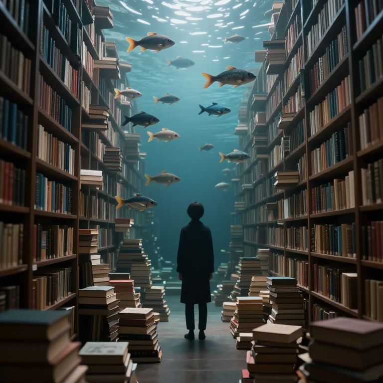 In a surreal library where knowledge floats like fish in an ocean of thought, a solitary figure stands amidst the weight of books, contemplating the boundless depths of imagination and the quiet whispers of forgotten stories.