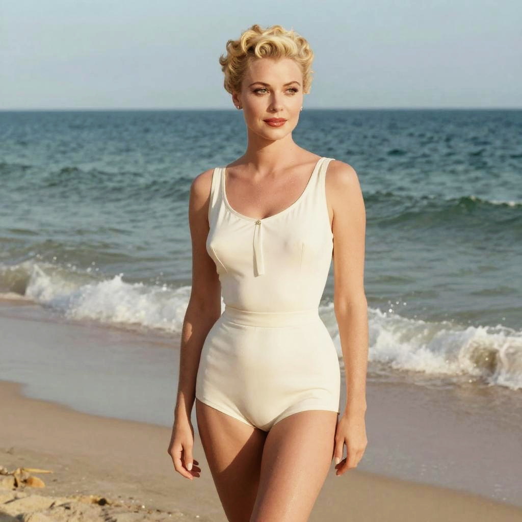Grace Kelly swimsuit fashion shot, 1950s glamour beachwear, elegant and refined expression, old Hollywood elegance, soft focus background with ocean and sands, pastel hues, iconic mid-century style, timeless beauty and poise, subtle breeze effect