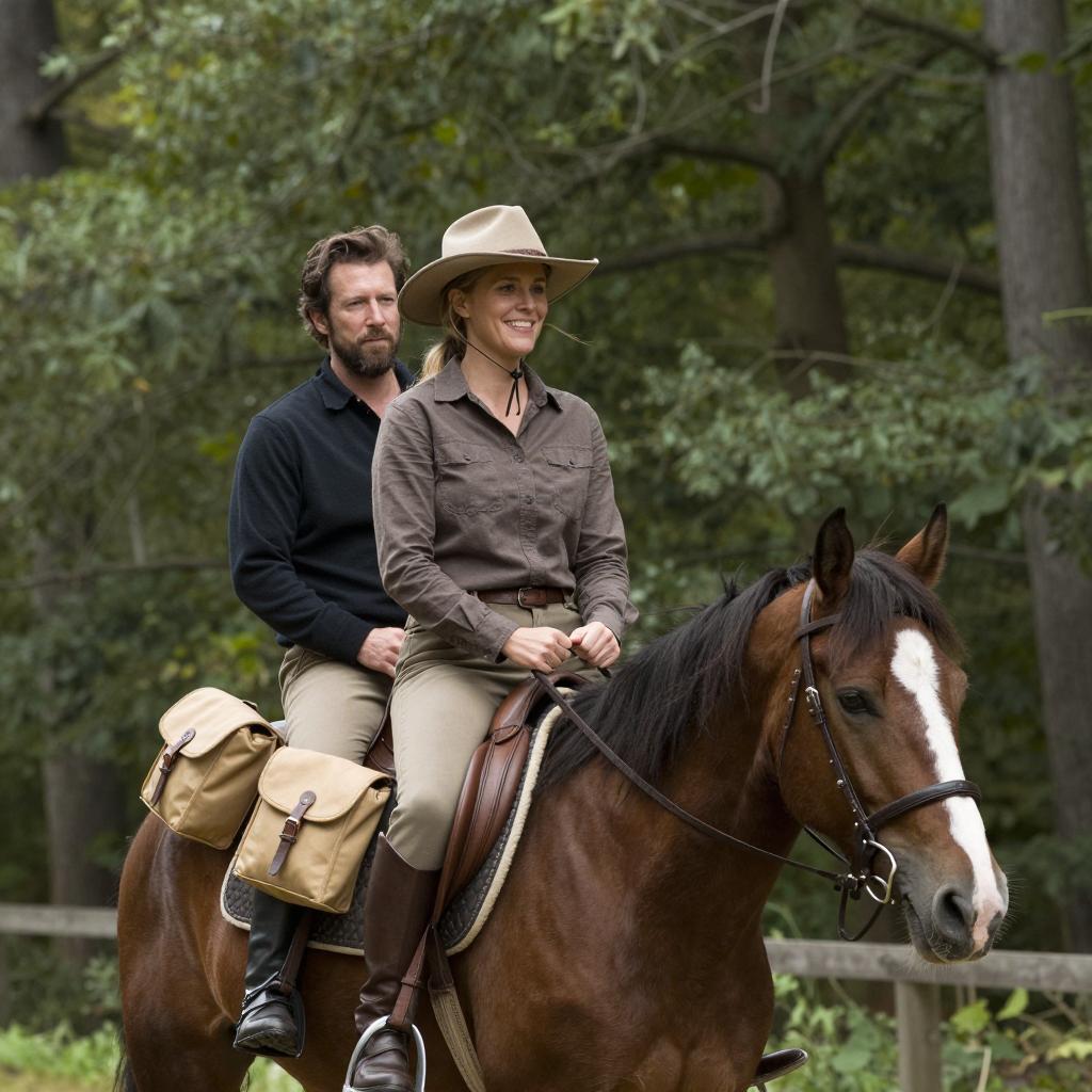 Photograph of two people riding a brown horse through a forest. The woman in front wears a tan hat and brown long-sleeve shirt, smiling. The man behind her has dark hair, a beard, and wears a black long-sleeve shirt. The horse has a brown mane and white blaze on its face. Both wear beige saddlebags. Trees with dense green foliage fill the background.