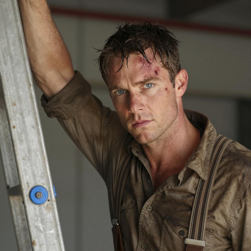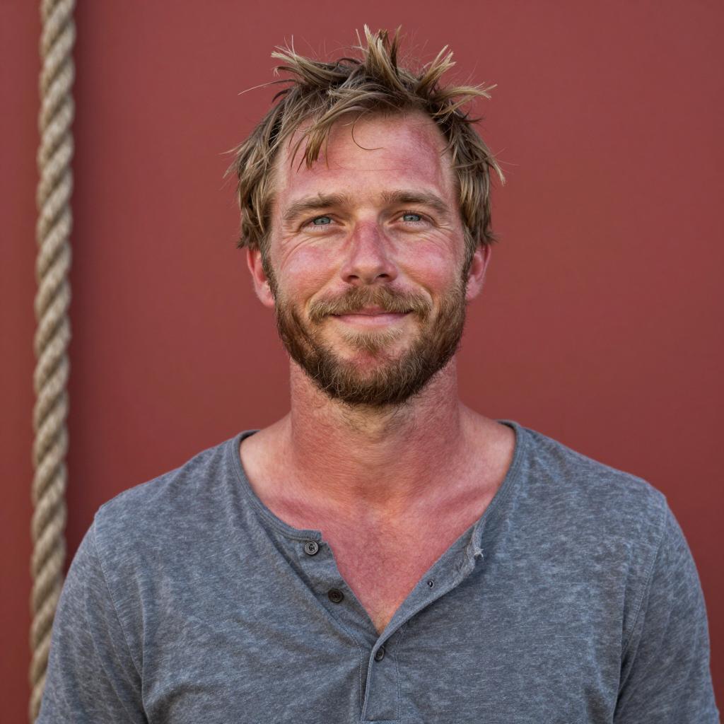Man with light brown, messy hair, and light beard, smiling slightly, has red, slightly sunburned skin, wearing a grey, loose-fitting shirt. Background is solid red with a thick, twisted rope on the left. His eyes are blue and he is looking slightly upward.