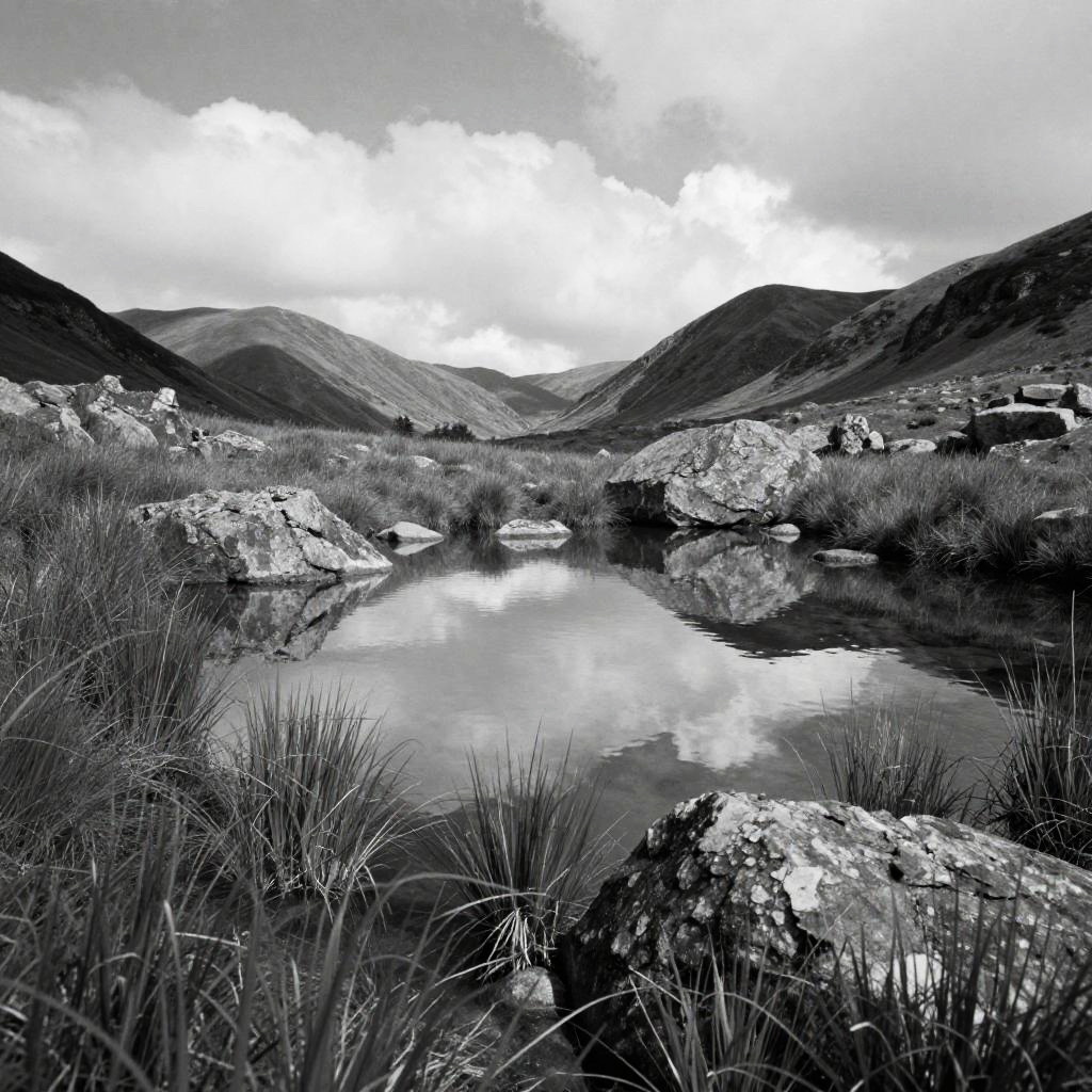Black and white photograph of a serene mountain landscape. A calm, reflective pond is centered, surrounded by rocks and tall grass in the foreground. In the background, rolling hills and mountains rise under a partially cloudy sky. The image has high contrast, emphasizing the textures of the grass, rocks, and water's surface. The overall mood is peaceful and natural.