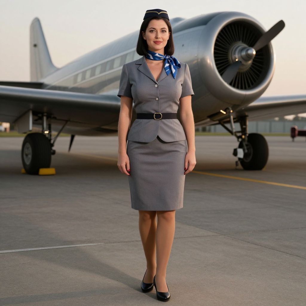 Photograph of a confident woman with dark hair, wearing a gray 1950s-style pilot uniform and blue scarf, standing in front of a silver