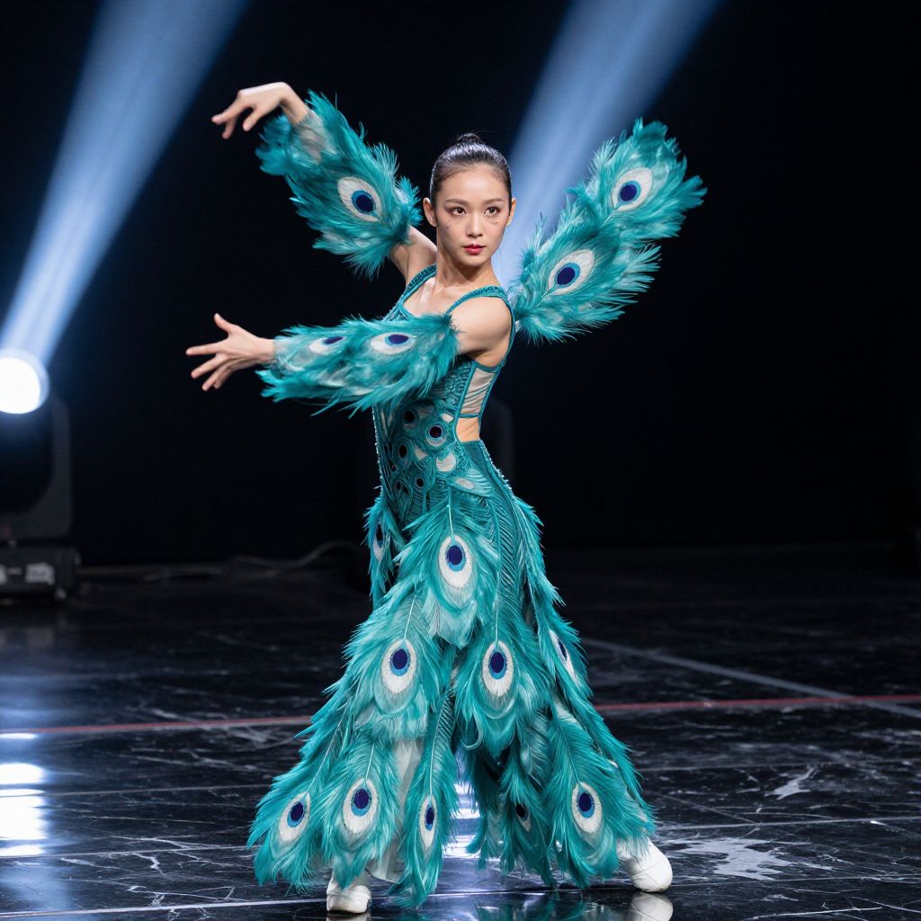 A modern peacock dancer in a sleek, avant-garde performance outfit made entirely of translucent teal-feathered fabric that forms a dynamic eye pattern on her arms and torso, performing on a black marble stage under spotlights, her face is sharp and elegant with high cheekbones and a faint smudge of makeup highlighting her deep brown irises
