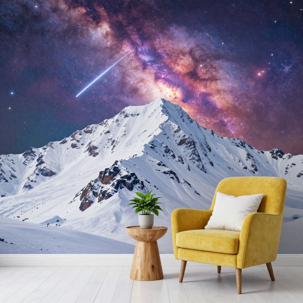 Interior scene featuring a vibrant wall mural of a snow-covered mountain under a colorful galaxy sky with stars and a shooting star. The room includes a mustard yellow armchair with a white pillow and a small wooden side table with a potted plant, set against a white wooden floor.