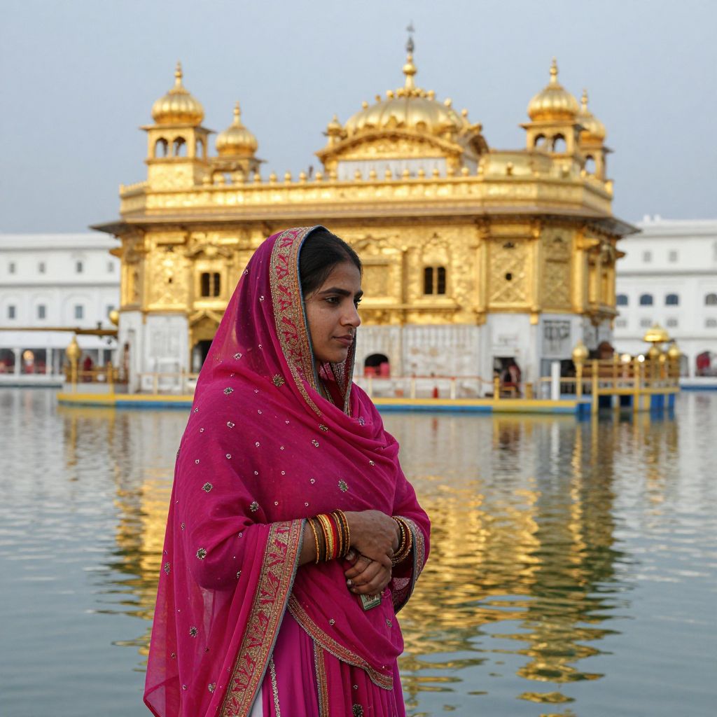 Photograph of a young Indian woman in a red and gold traditional outfit, standing in front of the golden Sikh temple, Harmandir Sahib,