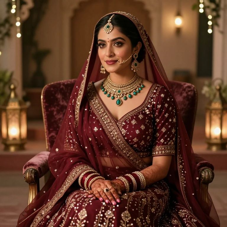 A cinematic portrait of a radiant bride with a defined cheekbone structure and expressive hazel eyes, wearing a dark maroon bridal lehenga with a delicate mirror work detail, seated gracefully on a velvet-padded chair in a traditional courtyard setting lit by lanterns and string lights
