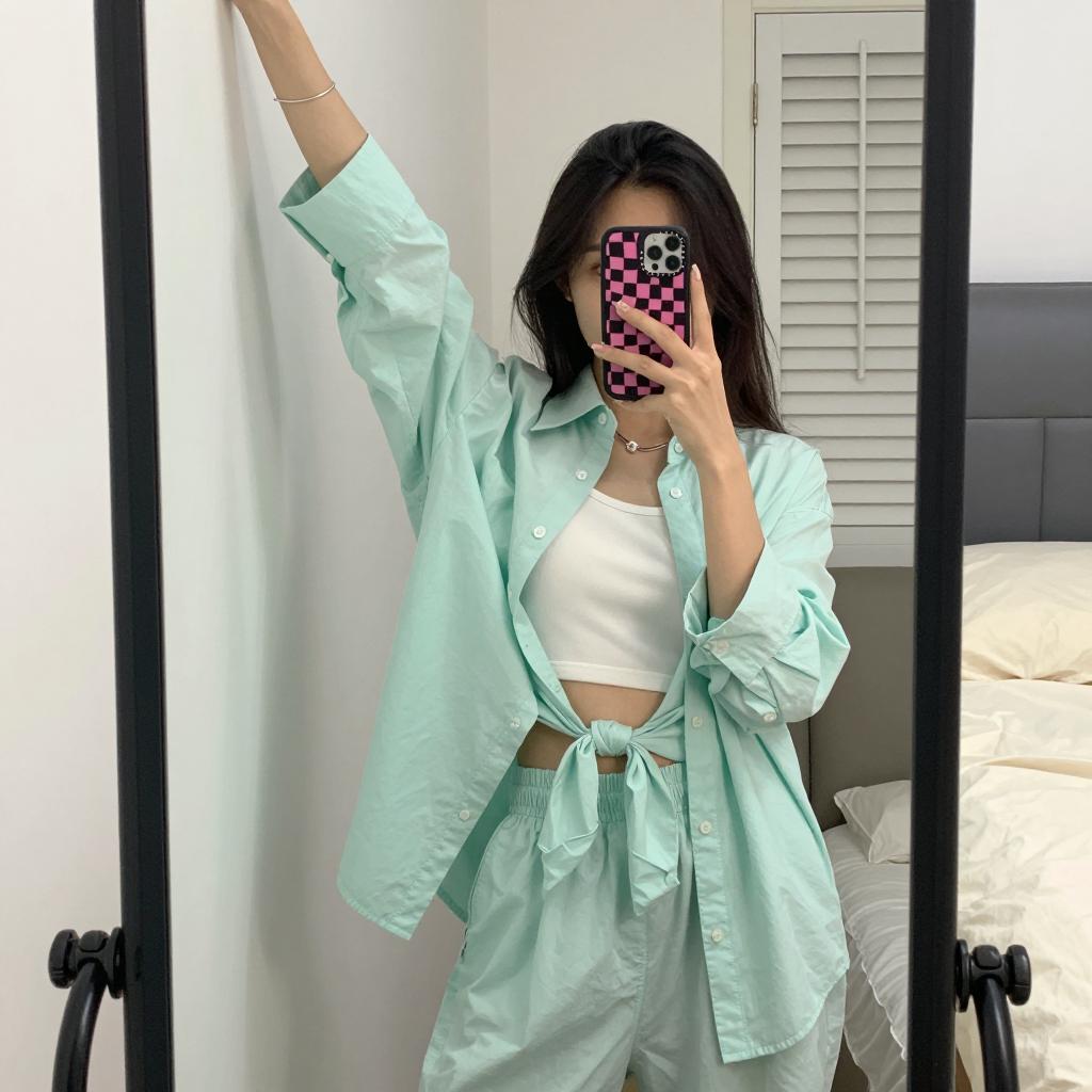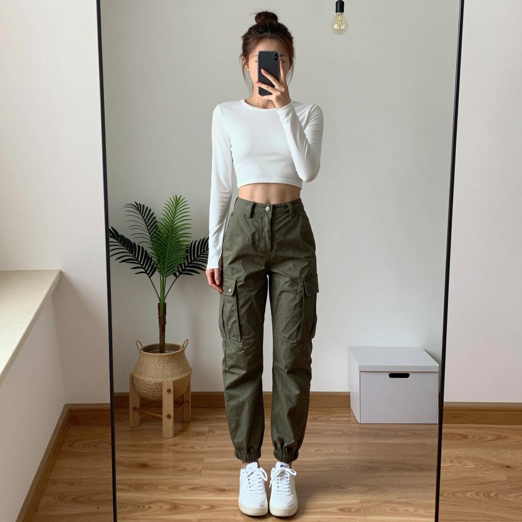 Photograph of a woman with straight brown hair sitting on a white tiled floor, taking a selfie with an iPhone. She wears a green oversized hoodie and black Adidas track pants with white stripes. Her right hand rests on the floor while her left hand holds the phone. The background has a white couch and a black and white wall art piece. She has a neutral expression, and her face is partially obscured by the phone. The room is well-lit with white walls.