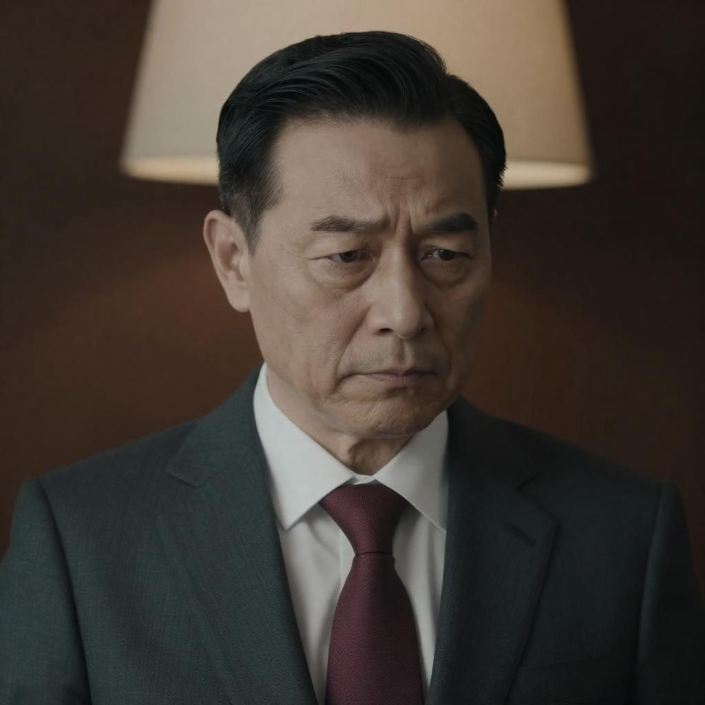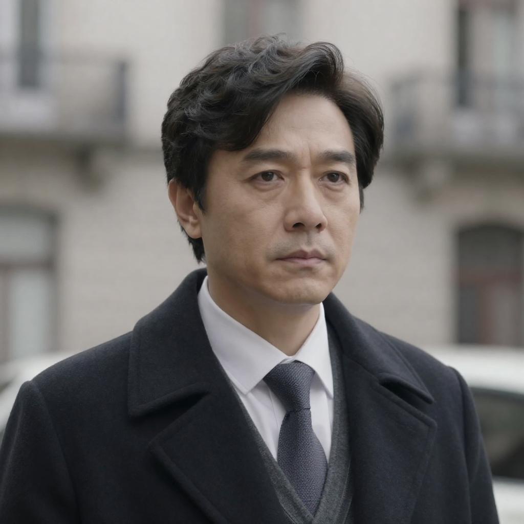 Photograph of a middle-aged man with dark, slightly wavy hair and a serious expression. He wears a black coat over a white shirt and a patterned tie. The blurred background features an out-of-focus urban building with light-colored walls and windows. The man is centered in the frame, looking slightly to the right.
